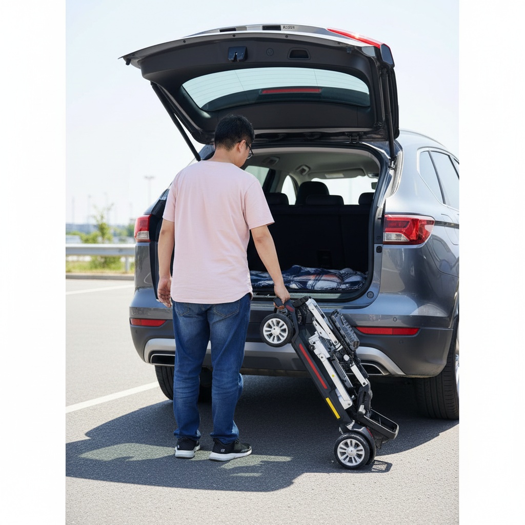A very versatile folding travel mobility scooter. Perfect for easy loading into the car boot by leaning one end against the boot and leveraging the scooter weight in. Safe and stable – being a true four wheeler. Great for travel.